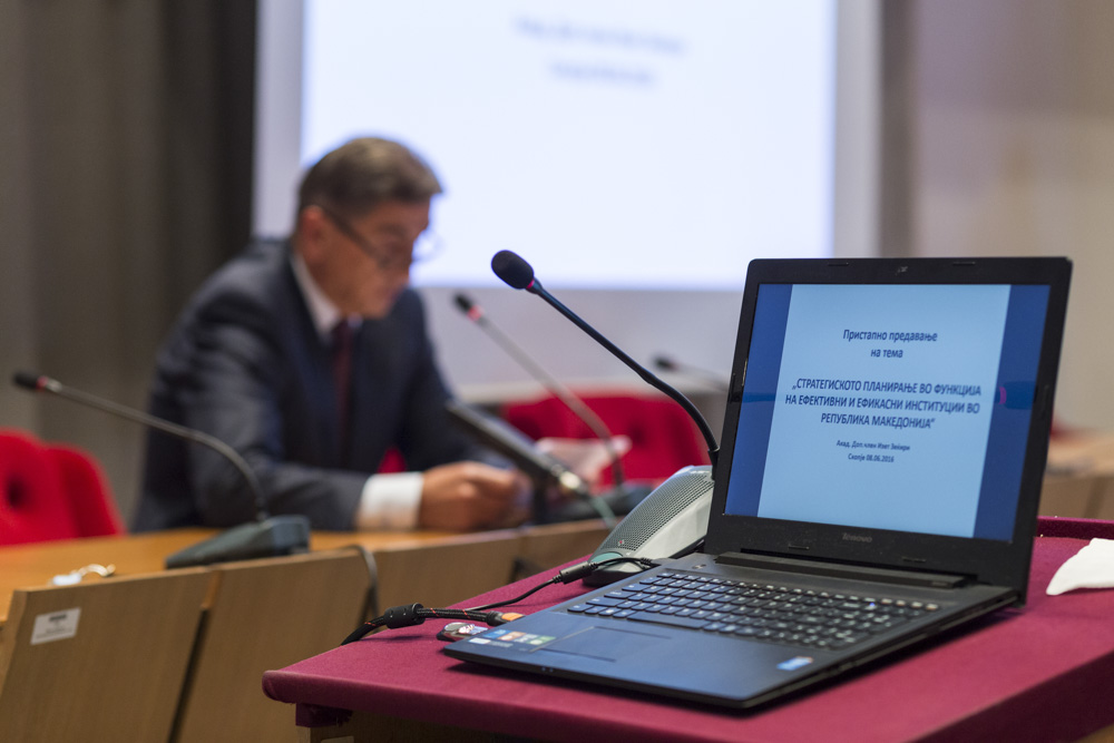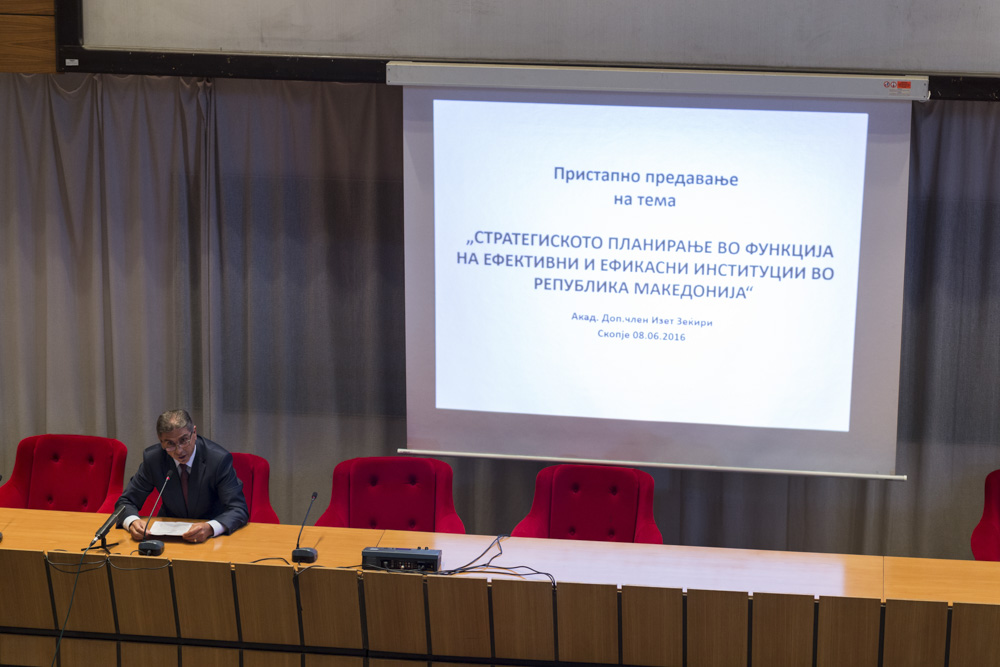 Проф. д-р Изет Зекири, дописен член на МАНУ, одржа пристапно предавање на тема: „Стратегиското планирање во функција на ефективни и ефикасни институции во Република Македонија“.